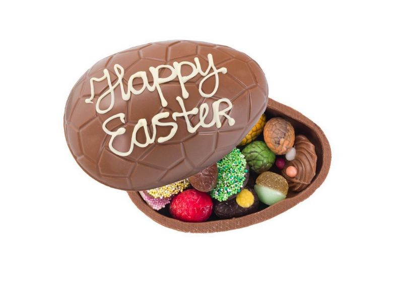 Een chocolade ei, goed gevuld met diverse soorten vrolijke paaschocolade. Het ei is verpakt in folie en voorzien van "Happy Easter" kaartje en strik. Besteleenheid: 12 stuks. Levertijd 2-3 weken.
