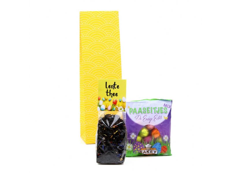Verras jouw medewerkers met dit feestelijke Paasgeschenk, gevuld met lente thee en smakelijke paaseitjes. Een geel geschenkzakje is opgemaakt met: een zakje lente thee 50 gram en een zakje paaseitjesmix 100 gram. Besteleenheid: 12 stuks. Levertijd 2-3 weken.