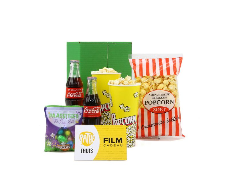 Even een middagje niks, een mooi moment om een film te kijken! Met deze voucher kun je éénmalig een film naar keuze kijken. Een sfeervolle geschenkdoos is opgemaakt met: een Pathé Thuis film cadeaukaart, twee papieren popcorn bekers, een zak zoete popcorn 70 gram, twee flesjes Coca Cola à 20 cl en een zakje paaseitjes mix 100 gram. Besteleenheid: 12 stuks. Levertijd 2-3 weken.